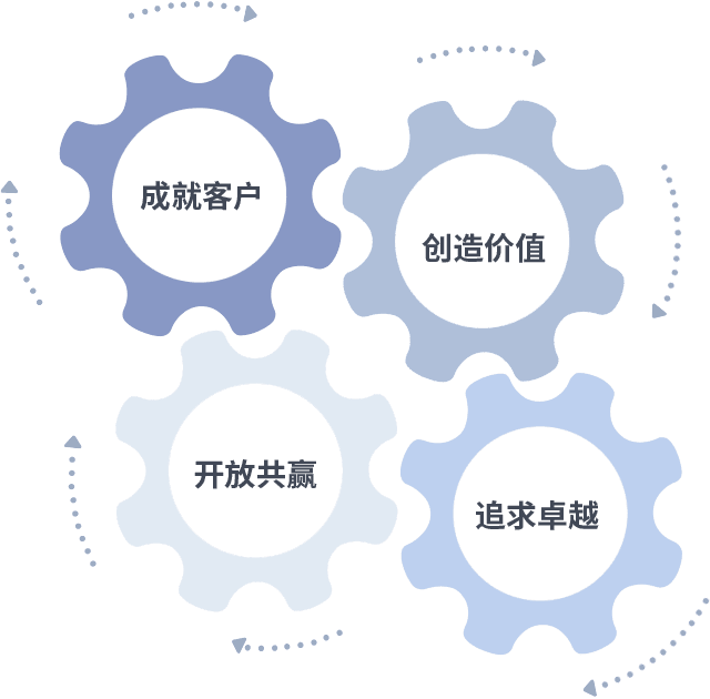 成就客户是一切决策的出发点,,,创造价值是衡量所有工作的标准,,追求卓越是我们做事做人的态度,,,开放共赢是我们的格局也是最终的结果。。。价值观的齿轮环环相扣,,推动着组织里的每个人不断向前。。。